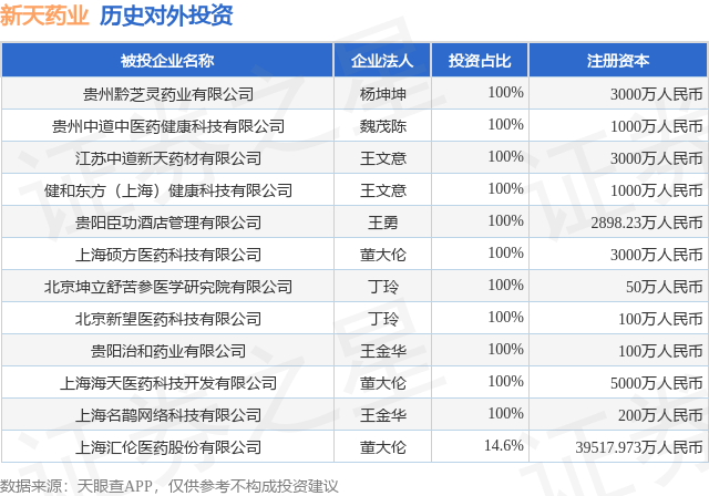 证券之星消息,根据天眼查APP显示,新天药业(002873.SZ)新增一起对外投资事件,被投资公司为贵州黔芝灵药业有限公司,法定代表人杨坤坤,投资占比为100%。该公司从事农副食品加工业,注册资本为3000万人民币。目前,新天药业共存在对外投资12项,详见下表: