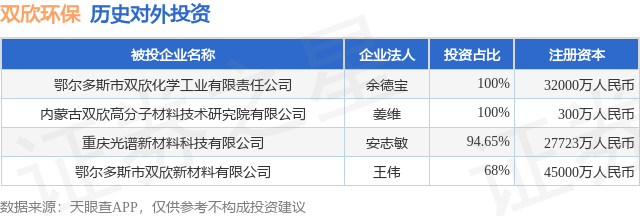 证券之星消息,根据天眼查APP显示,双欣环保(001369.SZ)新增一起对外投资事件,被投资公司为鄂尔多斯市双欣化学工业有限责任公司,法定代表人余德宝,投资占比为100%。该公司从事化学原料和化学制品制造业,注册资本为32000万人民币。目前,双欣环保共存在对外投资4项,详见下表: