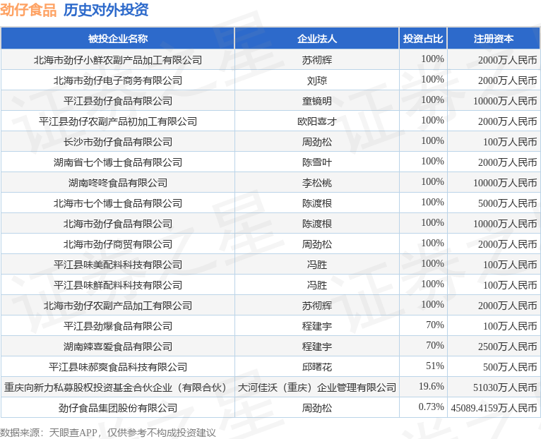 证券之星消息,根据天眼查APP显示,劲仔食品(003000.SZ)新增一起对外投资事件,被投资公司为北海市劲仔小鲜农副产品加工有限公司,法定代表人苏彻辉,投资占比为100%。该公司从事农副食品加工业,注册资本为2000万人民币。目前,劲仔食品共存在对外投资18项,详见下表: