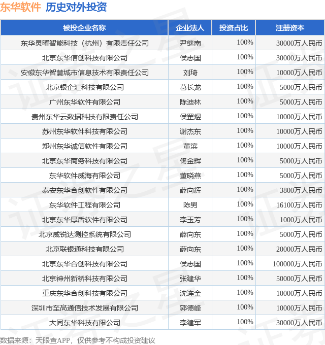 证券之星消息,根据天眼查APP显示,东华软件(002065.SZ)新增一起对外投资事件,被投资公司为东华灵曜智能科技(杭州)有限责任公司,法定代表人尹继南,投资占比为100%。该公司从事软件和信息技术服务业,注册资本为30000万人民币。目前,东华软件共存在对外投资118项,投资占比前20的项目见下表:
