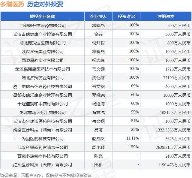 证券之星消息,根据天眼查APP显示,多瑞医药(301075.SZ)新增一起对外投资事件,被投资公司为西藏瑞升祥医药有限公司,法定代表人邓晓尧,投资占比为100%。该公司从事医药制造业,注册资本为200万人民币。目前,多瑞医药共存在对外投资17项,详见下表: