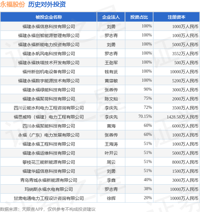 证券之星消息,根据天眼查APP显示,永福股份(300712.SZ)新增一起对外投资事件,被投资公司为福建永福聚荷科技有限公司,法定代表人陈文灿,投资占比为75%。该公司从事电力、热力生产和供应业,注册资本为2000万人民币。目前,永福股份共存在对外投资27项,投资占比前20的项目见下表: