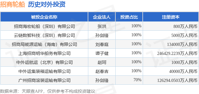 证券之星消息,根据天眼查APP显示,招商轮船(601872.SH)新增一起对外投资事件,被投资公司为招商海宏轮船(深圳)有限公司,法定代表人张洪,投资占比为100%。该公司从事水上运输业,注册资本为800万人民币。目前,招商轮船共存在对外投资7项,详见下表: