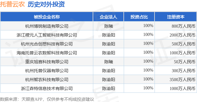 证券之星消息,根据天眼查APP显示,托普云农(301556.SZ)新增一起对外投资事件,被投资公司为杭州博锐制造有限公司,法定代表人陈曦,投资占比为100%。该公司从事专用设备制造业,注册资本为800万人民币。目前,托普云农共存在对外投资8项,详见下表: