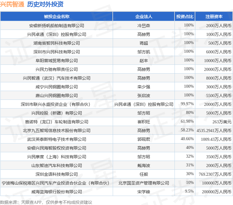 证券之星消息,根据天眼查APP显示,兴民智通(002355.SZ)新增一起对外投资事件,被投资公司为兴民控股(新疆)有限公司,法定代表人邹方昭,投资占比为80%。该公司从事卫生,注册资本为5000万人民币。目前,兴民智通共存在对外投资23项,投资占比前20的项目见下表: