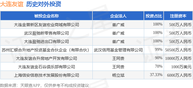通过天眼查大数据分析,大连友谊(集团)股份有限公司共对外投资了8家企业,参与招投标项目4次;此外企业还拥有行政许可13个。