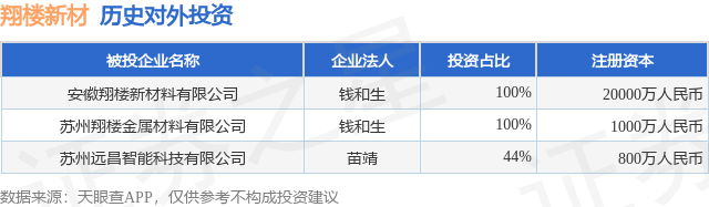 证券之星消息,根据天眼查APP显示,翔楼新材(301160.SZ)新增一起对外投资事件,被投资公司为苏州远昌智能科技有限公司,法定代表人苗靖,投资占比为44%。该公司从事通用设备制造业,注册资本为800万人民币。目前,翔楼新材共存在对外投资3项,详见下表:
