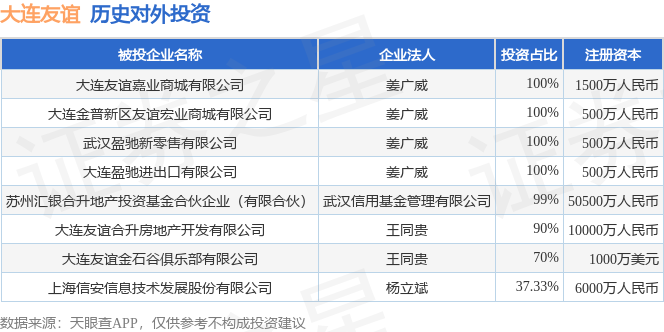 证券之星消息,根据天眼查APP显示,大连友谊(000679.SZ)新增一起对外投资事件,被投资公司为大连友谊嘉业商城有限公司,法定代表人姜广威,投资占比为100%。该公司从事零售业,注册资本为1500万人民币。目前,大连友谊共存在对外投资8项,详见下表: