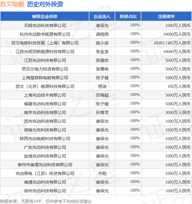 证券之星消息,根据天眼查APP显示,苏文电能(300982.SZ)新增一起对外投资事件,被投资公司为无锡充动科技有限公司,法定代表人姜保光,投资占比为100%。该公司从事航空运输业,注册资本为1000万人民币。目前,苏文电能共存在对外投资33项,投资占比前20的项目见下表: