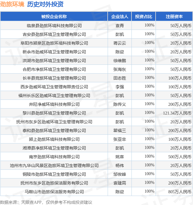 证券之星消息,根据天眼查APP显示,劲旅环境(001230.SZ)新增一起对外投资事件,被投资公司为临泉县劲旅环境科技有限公司,法定代表人袁青,投资占比为100%。该公司从事公共设施管理业,注册资本为50万人民币。目前,劲旅环境共存在对外投资103项,投资占比前20的项目见下表: