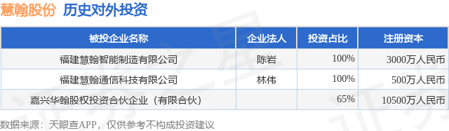证券之星消息,根据天眼查APP显示,慧翰股份(301600.SZ)新增一起对外投资事件,被投资公司为嘉兴华翰股权投资合伙企业(有限合伙),法定代表人,投资占比为65%。该公司从事资本市场服务,注册资本为10500万人民币。目前,慧翰股份共存在对外投资3项,详见下表: