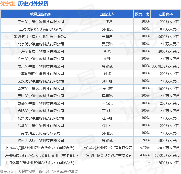 通过天眼查大数据分析,上海优宁维生物科技股份有限公司共对外投资了20家企业,参与招投标项目1666次;财产线索方面有商标信息21条,专利信息1条,著作权信息20条;此外企业还拥有行政许可10个。
