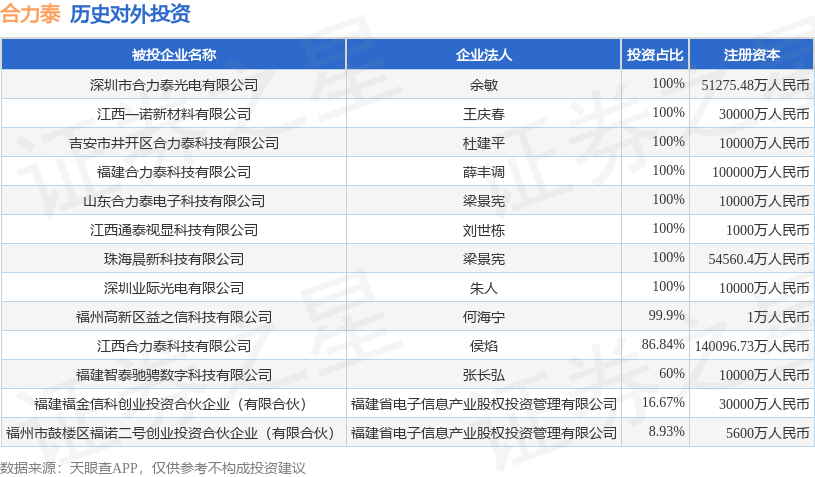 证券之星消息,根据天眼查APP显示,合力泰(002217.SZ)新增一起对外投资事件,被投资公司为福建福金信科创业投资合伙企业(有限合伙),法定代表人福建省电子信息产业股权投资管理有限公司,投资占比为16.67%。该公司从事资本市场服务,注册资本为30000万人民币。目前,合力泰共存在对外投资13项,详见下表: