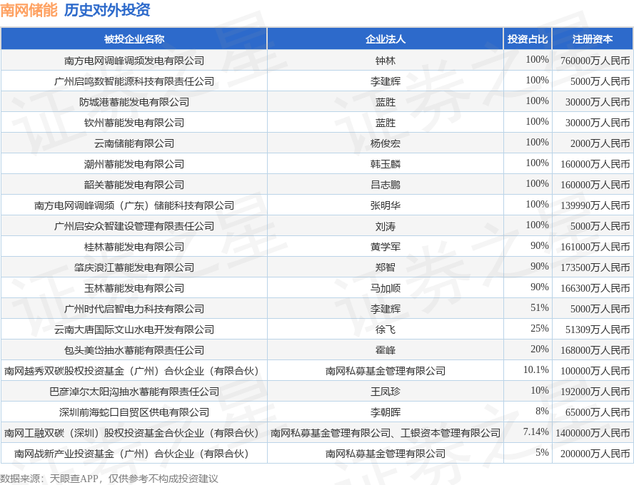 证券之星消息,根据天眼查APP显示,南网储能(600995.SH)新增一起对外投资事件,被投资公司为南网工融双碳(深圳)股权投资基金合伙企业(有限合伙),法定代表人南网私募基金管理有限公司、工银资本管理有限公司,投资占比为7.14%。该公司从事资本市场服务,注册资本为1400000万人民币。目前,南网储能共存在对外投资21项,投资占比前20的项目见下表: