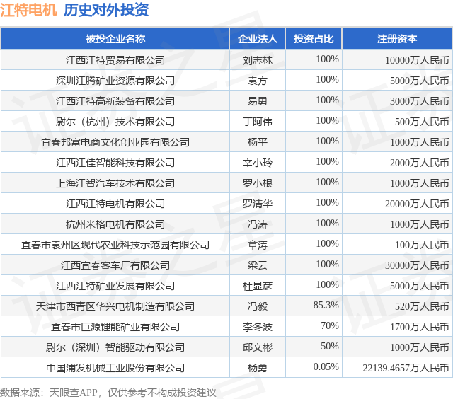 证券之星消息,根据天眼查APP显示,江特电机(002176.SZ)新增一起对外投资事件,被投资公司为江西江特贸易有限公司,法定代表人刘志林,投资占比为100%。该公司从事电气机械和器材制造业,注册资本为10000万人民币。目前,江特电机共存在对外投资16项,详见下表:
