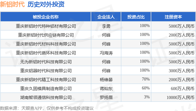 证券之星消息,根据天眼查APP显示,新铝时代(301613.SZ)新增一起对外投资事件,被投资公司为重庆新铝时代特种铝材有限公司,法定代表人李勇,投资占比为100%。该公司从事有色金属冶炼和压延加工业,注册资本为5000万人民币。目前,新铝时代共存在对外投资9项,详见下表: