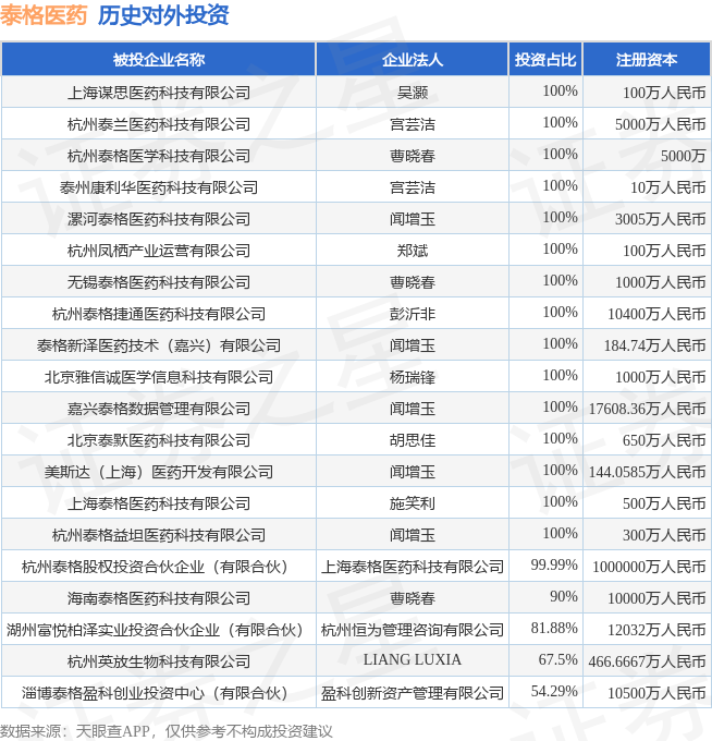 证券之星消息,根据天眼查APP显示,泰格医药(300347.SZ)新增一起对外投资事件,被投资公司为Frontage Holdings Corporation,法定代表人,投资占比为11.1%。该公司从事,注册资本为。目前,泰格医药共存在对外投资50项,投资占比前20的项目见下表: