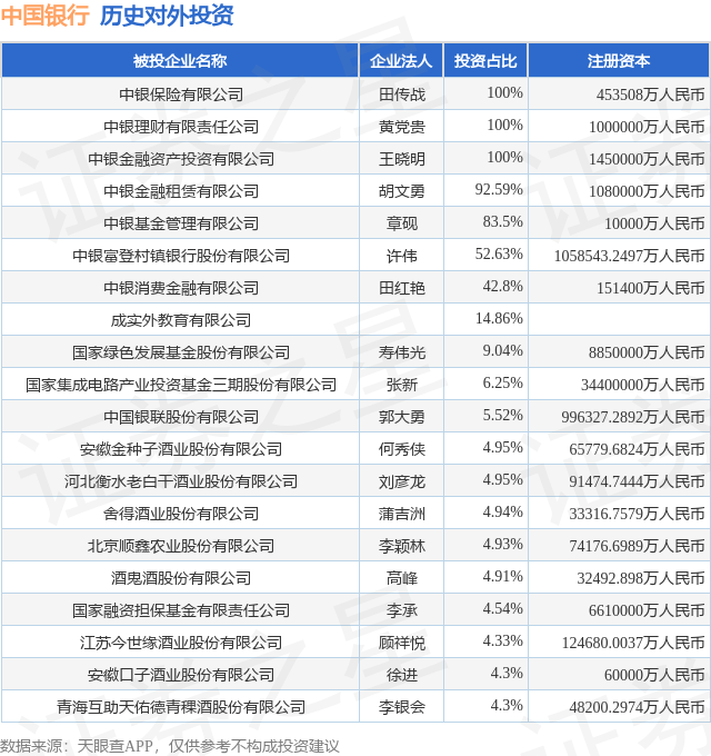 证券之星消息,根据天眼查APP显示,中国银行(601988.SH)新增一起对外投资事件,被投资公司为成实外教育有限公司,法定代表人,投资占比为14.86%。该公司从事,注册资本为。目前,中国银行共存在对外投资910项,投资占比前20的项目见下表: