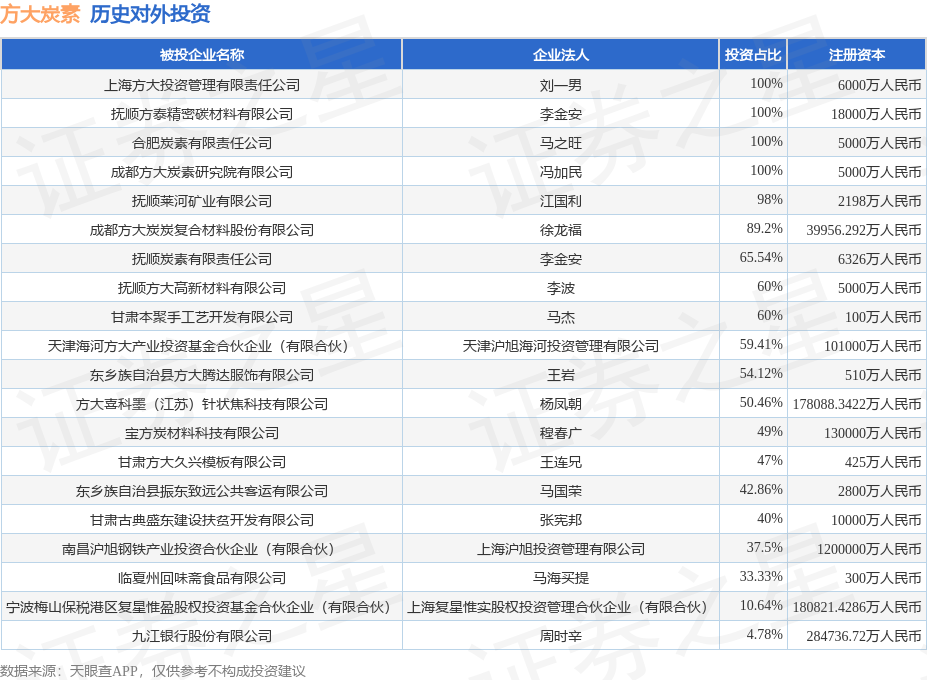 通过天眼查大数据分析,方大炭素新材料科技股份有限公司共对外投资了28家企业,参与招投标项目1372次;财产线索方面有专利信息110条;此外企业还拥有行政许可38个。据2024年报数据,方大炭素长期股权投资68.33亿元,同比增0.85%。
