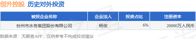 证券之星消息,根据天眼查APP显示,创升控股(02680.HK)新增一起对外投资事件,被投资公司为台州市水务集团股份有限公司,法定代表人杨俊,投资占比为6%。该公司从事水的生产和供应业,注册资本为20000万人民币。目前,创升控股共存在对外投资1项,详见下表: