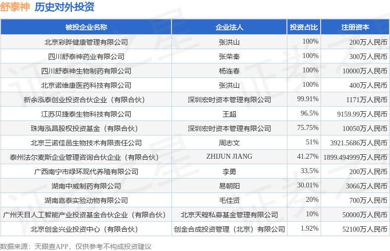 证券之星消息,根据天眼查APP显示,舒泰神(300204.SZ)新增一起对外投资事件,被投资公司为广州天目人工智能产业投资基金合伙企业(有限合伙),法定代表人北京天穆私募基金管理有限公司,投资占比为10%。该公司从事资本市场服务,注册资本为50000万人民币。目前,舒泰神共存在对外投资14项,详见下表: