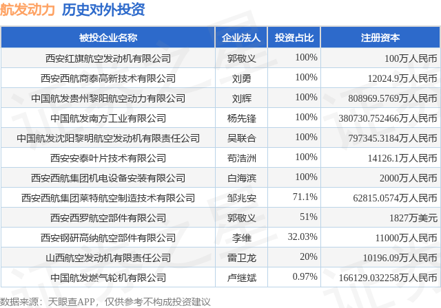 证券之星消息,根据天眼查APP显示,航发动力(600893.SH)新增一起对外投资事件,被投资公司为西安红旗航空发动机有限公司,法定代表人郭敬义,投资占比为100%。该公司从事通用设备制造业,注册资本为100万人民币。目前,航发动力共存在对外投资12项,详见下表: