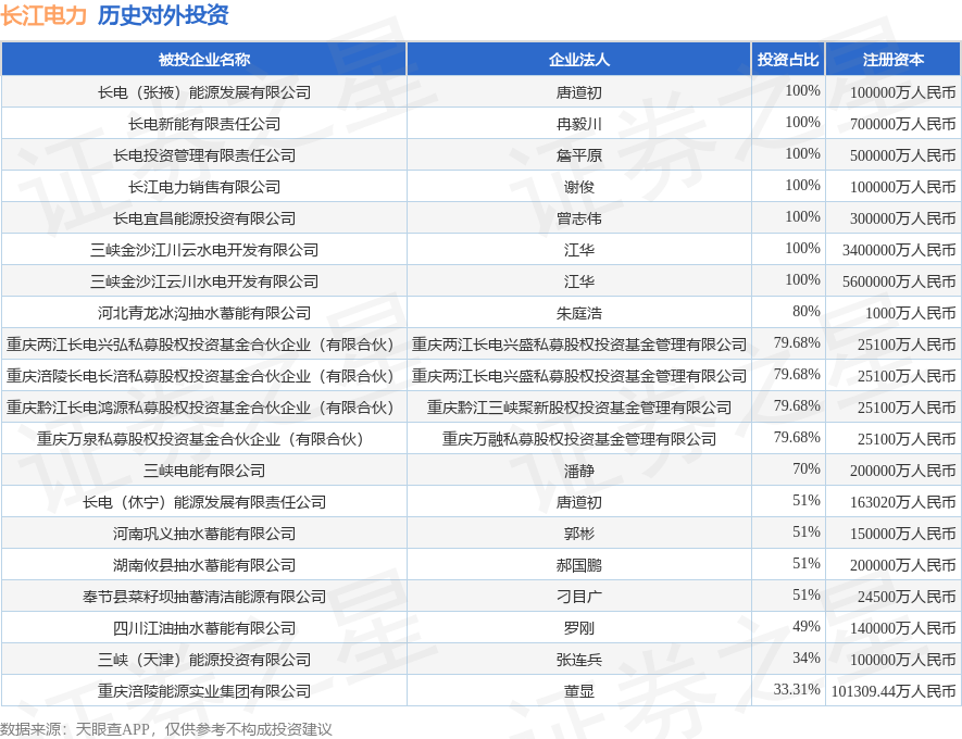 证券之星消息,根据天眼查APP显示,长江电力(600900.SH)新增一起对外投资事件,被投资公司为河北青龙冰沟抽水蓄能有限公司,法定代表人朱庭浩,投资占比为80%。该公司从事电力、热力生产和供应业,注册资本为1000万人民币。目前,长江电力共存在对外投资44项,投资占比前20的项目见下表: