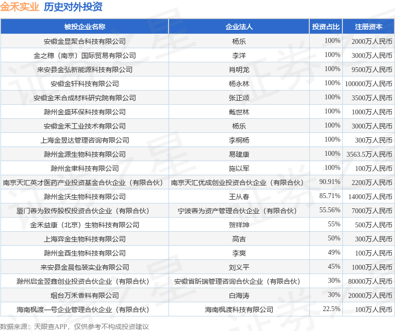 证券之星消息,根据天眼查APP显示,金禾实业(002597.SZ)新增一起对外投资事件,被投资公司为安徽金显聚合科技有限公司,法定代表人杨乐,投资占比为100%。该公司从事化学原料和化学制品制造业,注册资本为2000万人民币。目前,金禾实业共存在对外投资37项,投资占比前20的项目见下表: