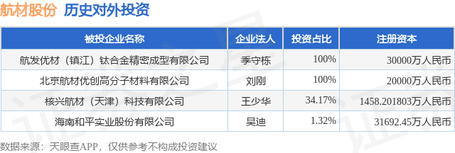 证券之星消息,根据天眼查APP显示,航材股份(688563.SH)新增一起对外投资事件,被投资公司为航发优材(镇江)钛合金精密成型有限公司,法定代表人季守栋,投资占比为100%。该公司从事有色金属冶炼和压延加工业,注册资本为30000万人民币。目前,航材股份共存在对外投资4项,详见下表: