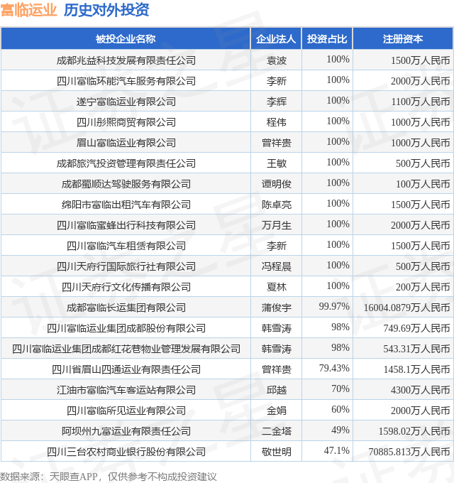 证券之星消息,根据天眼查APP显示,富临运业(002357.SZ)新增一起对外投资事件,被投资公司为四川富临所见运业有限公司,法定代表人金娟,投资占比为60%。该公司从事商务服务业,注册资本为2000万人民币。目前,富临运业共存在对外投资24项,投资占比前20的项目见下表: