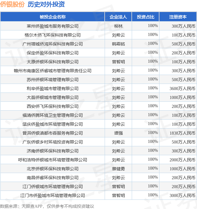 证券之星消息,根据天眼查APP显示,侨银股份(002973.SZ)新增一起对外投资事件,被投资公司为莱州侨盈城市服务有限公司,法定代表人柳林,投资占比为100%。该公司从事公共设施管理业,注册资本为300万人民币。目前,侨银股份共存在对外投资179项,投资占比前20的项目见下表: