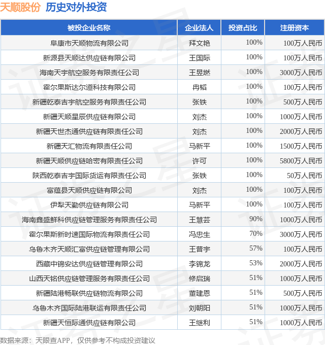 通过天眼查大数据分析,新疆天顺供应链股份有限公司共对外投资了29家企业,参与招投标项目53次;财产线索方面有商标信息6条,著作权信息18条;此外企业还拥有行政许可8个。据2024年报数据,天顺股份长期股权投资2467.69万元,同比增21.01%。