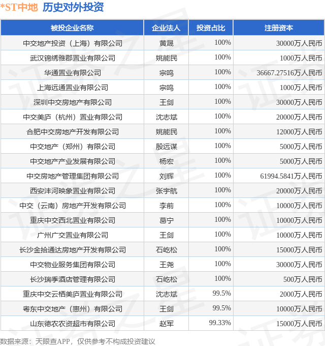 证券之星消息,根据天眼查APP显示,*ST中地(000736.SZ)新增一起对外投资事件,被投资公司为中交物业服务(张家口桥东区)有限公司,法定代表人李德朋,投资占比为49%。该公司从事房地产业,注册资本为200万人民币。目前,*ST中地共存在对外投资66项,投资占比前20的项目见下表: