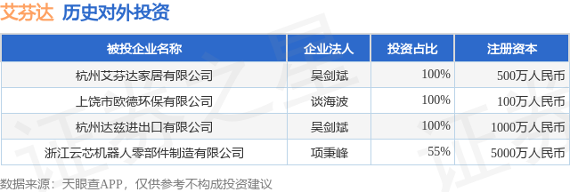 证券之星消息,根据天眼查APP显示,艾芬达(301575.SZ)新增一起对外投资事件,被投资公司为浙江云芯机器人零部件制造有限公司,法定代表人项秉峰,投资占比为55%。该公司从事汽车制造业,注册资本为5000万人民币。目前,艾芬达共存在对外投资4项,详见下表: