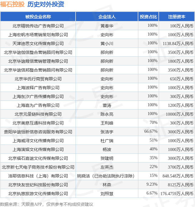 证券之星消息,根据天眼查APP显示,福石控股(300071.SZ)新增一起对外投资事件,被投资公司为中财紫东太初(淄博)创业投资合伙企业(有限合伙),法定代表人中财金控投资有限公司,投资占比为5%。该公司从事商务服务业,注册资本为4000万人民币。目前,福石控股共存在对外投资23项,投资占比前20的项目见下表:
