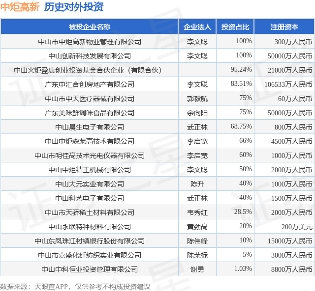 证券之星消息,根据天眼查APP显示,中炬高新(600872.SH)新增一起对外投资事件,被投资公司为中山火炬盈康创业投资基金合伙企业(有限合伙),法定代表人,投资占比为95.24%。该公司从事资本市场服务,注册资本为21000万人民币。目前,中炬高新共存在对外投资17项,详见下表: