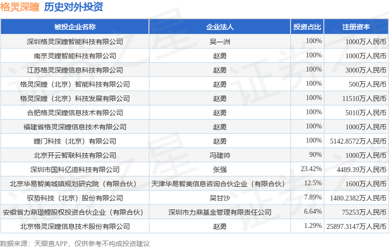 证券之星消息,根据天眼查APP显示,格灵深瞳(688207.SH)新增一起对外投资事件,被投资公司为深圳格灵深瞳智能科技有限公司,法定代表人吴一洲,投资占比为100%。该公司从事软件和信息技术服务业,注册资本为1000万人民币。目前,格灵深瞳共存在对外投资14项,详见下表: