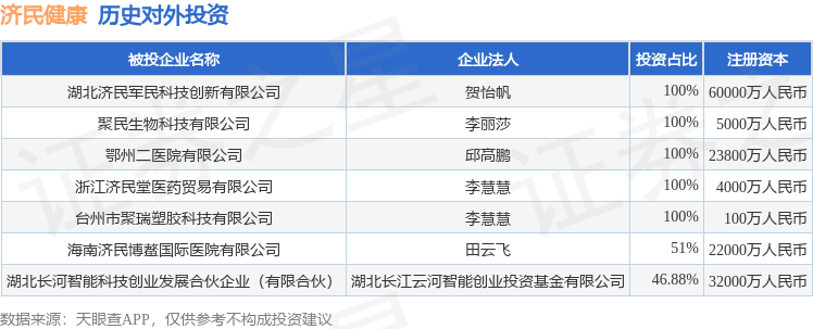 证券之星消息,根据天眼查APP显示,济民健康(603222.SH)新增一起对外投资事件,被投资公司为湖北济民军民科技创新有限公司,法定代表人贺怡帆,投资占比为100%。该公司从事软件和信息技术服务业,注册资本为60000万人民币。目前,济民健康共存在对外投资7项,详见下表: