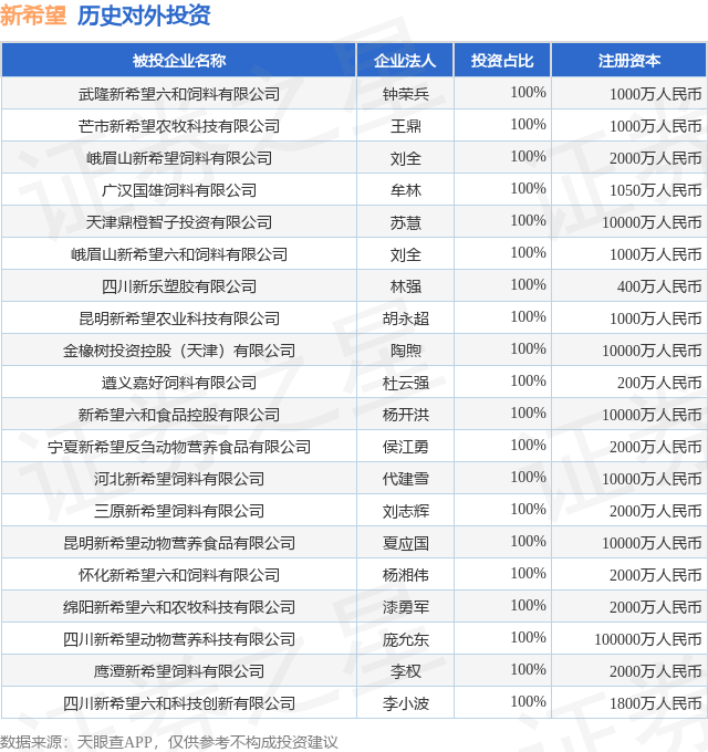 证券之星消息,根据天眼查APP显示,新希望(000876.SZ)新增一起对外投资事件,被投资公司为新六创益(福建)农牧发展有限公司,法定代表人司小明,投资占比为73.17%。该公司从事农副食品加工业,注册资本为287000万人民币。目前,新希望共存在对外投资55项,投资占比前20的项目见下表: