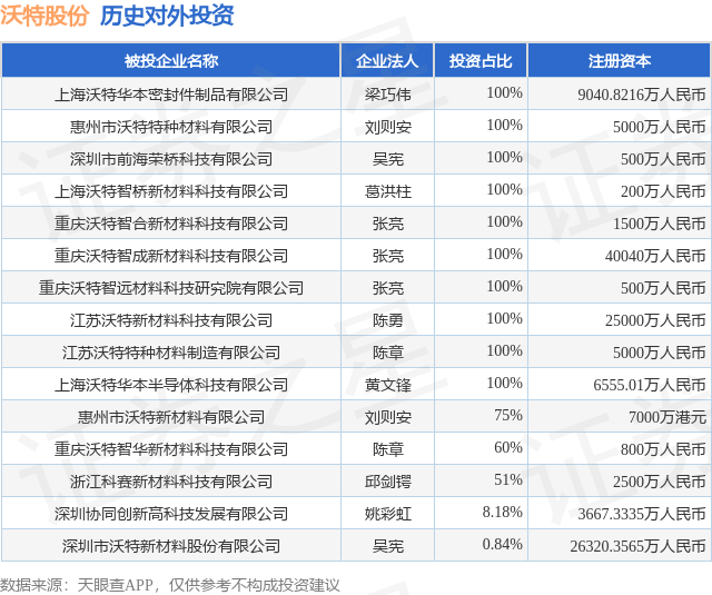 证券之星消息,根据天眼查APP显示,沃特股份(002886.SZ)新增一起对外投资事件,被投资公司为上海沃特华本密封件制品有限公司,法定代表人梁巧伟,投资占比为100%。该公司从事橡胶和塑料制品业,注册资本为9040.8216万人民币。目前,沃特股份共存在对外投资15项,详见下表: