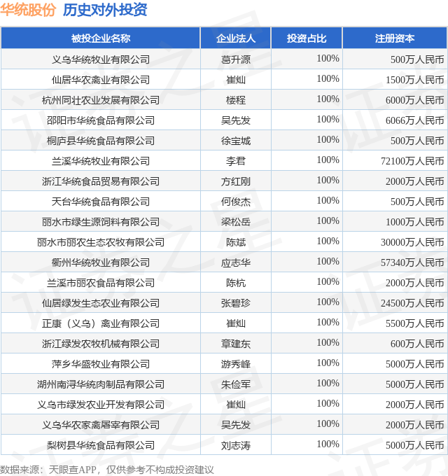证券之星消息,根据天眼查APP显示,华统股份(002840.SZ)新增一起对外投资事件,被投资公司为义乌华统牧业有限公司,法定代表人葛升源,投资占比为100%。该公司从事畜牧业,注册资本为500万人民币。目前,华统股份共存在对外投资71项,投资占比前20的项目见下表: