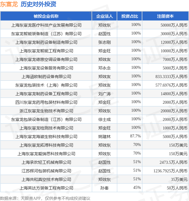 证券之星消息,根据天眼查APP显示,东富龙(300171.SZ)新增一起对外投资事件,被投资公司为上海伯豪生物技术有限公司,法定代表人,投资占比为34.02%。该公司从事科技推广和应用服务业,注册资本为4850万人民币。目前,东富龙共存在对外投资27项,投资占比前20的项目见下表: