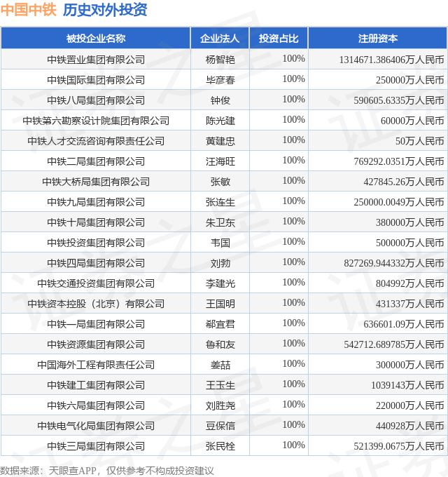证券之星消息,根据天眼查APP显示,中国中铁(601390.SH)新增一起对外投资事件,被投资公司为广东惠肇高速公路有限公司,法定代表人张忠刚,投资占比为51%。该公司从事土木工程建筑业,注册资本为10000万人民币。目前,中国中铁共存在对外投资135项,投资占比前20的项目见下表: