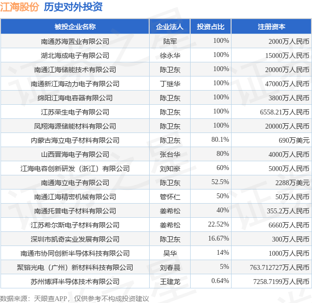 证券之星消息,根据天眼查APP显示,江海股份(002484.SZ)新增一起对外投资事件,被投资公司为江海电容创新研发(浙江)有限公司,法定代表人刘知豪,投资占比为60%。该公司从事计算机、通信和其他电子设备制造业,注册资本为5000万人民币。目前,江海股份共存在对外投资18项,详见下表: