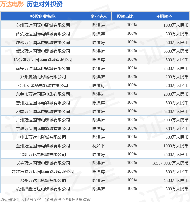 证券之星消息,根据天眼查APP显示,万达电影(002739.SZ)新增一起对外投资事件,被投资公司为广州方图科技有限公司,法定代表人朱锦钊,投资占比为25.62%。该公司从事其他制造业,注册资本为1344.5386万人民币。目前,万达电影共存在对外投资112项,投资占比前20的项目见下表: