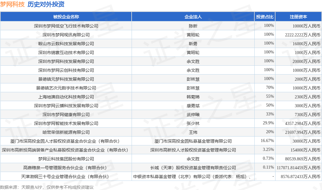 证券之星消息,根据天眼查APP显示,梦网科技(002123.SZ)新增一起对外投资事件,被投资公司为深圳市梦网低空飞行技术有限公司,法定代表人陈新,投资占比为100%。该公司从事研究和试验发展,注册资本为10000万人民币。目前,梦网科技共存在对外投资18项,详见下表: