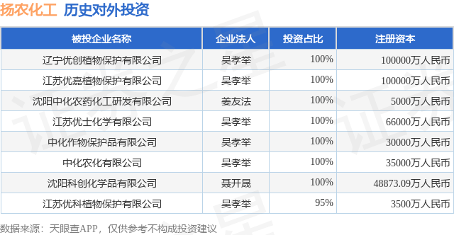 证券之星消息,根据天眼查APP显示,扬农化工(600486.SH)新增一起对外投资事件,被投资公司为江苏优科植物保护有限公司,法定代表人吴孝举,投资占比为95%。该公司从事化学原料和化学制品制造业,注册资本为3500万人民币。目前,扬农化工共存在对外投资8项,详见下表:
