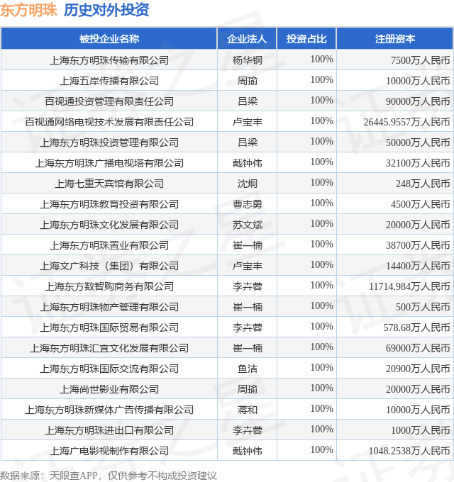 证券之星消息,根据天眼查APP显示,东方明珠(600637.SH)新增一起对外投资事件,被投资公司为长三角数智文化产业私募投资基金(上海)合伙企业(有限合伙),法定代表人,投资占比为-。该公司从事资本市场服务,注册资本为300300万人民币。目前,东方明珠共存在对外投资67项,投资占比前20的项目见下表: