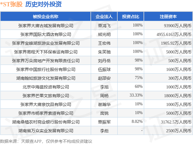 证券之星消息,根据天眼查APP显示,*ST张股(000430.SZ)新增一起对外投资事件,被投资公司为张家界芒果文旅有限公司,法定代表人周杨,投资占比为33.33%。该公司从事公共设施管理业,注册资本为18000万人民币。目前,*ST张股共存在对外投资13项,详见下表: