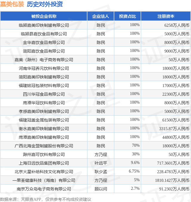 通过天眼查大数据分析,嘉美食品包装(滁州)股份有限公司共对外投资了22家企业,参与招投标项目54次;财产线索方面有商标信息17条,专利信息36条;此外企业还拥有行政许可39个。